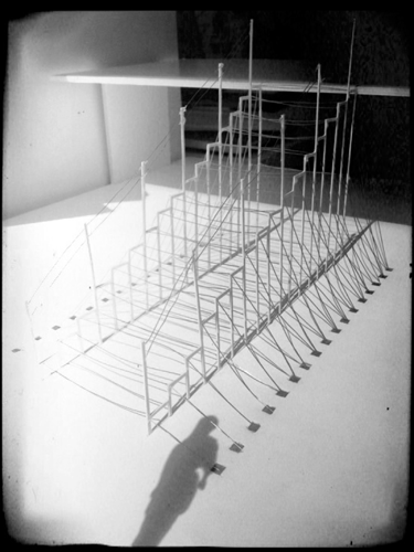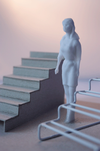 Door de transparante treden heeft de trap aan de voorzijde meer de gedaante van een brug terwijl de schaduw de functie onthult.