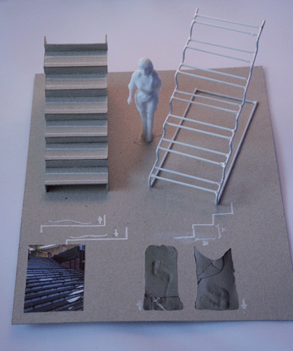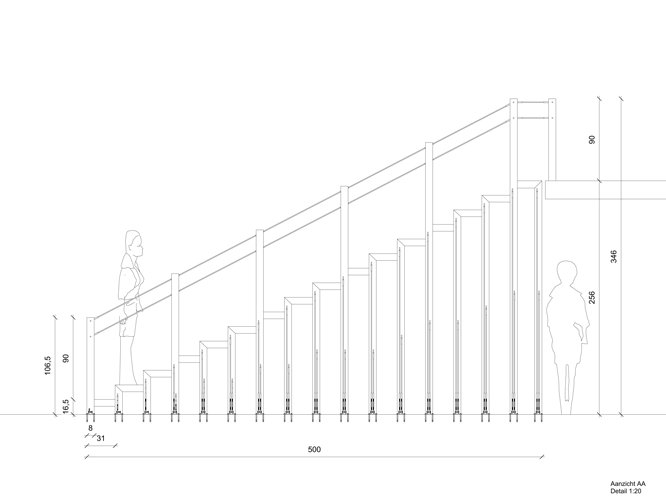 De trap is gemaakt in eenvoud en bestaat uit twee materialen. Het lopen staat centraal waardoor de twee elementen, drager en treden, niet los van elkaar ontworpen kunnen worden.